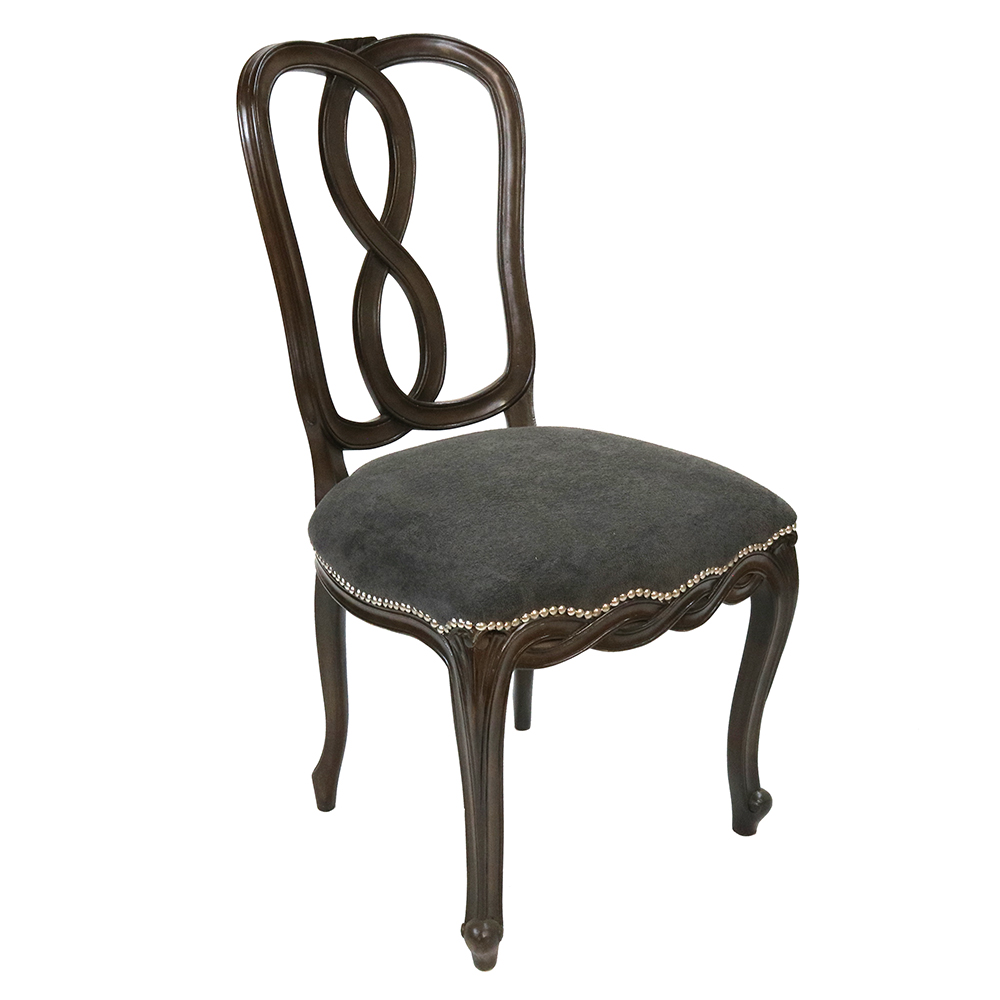This Madrid Loop side Chair is painted in walnut finish and upholstered in off-white fabric with strip nail heads. This beautiful side chair has a matching armchair that can be purchased as a set or separately.