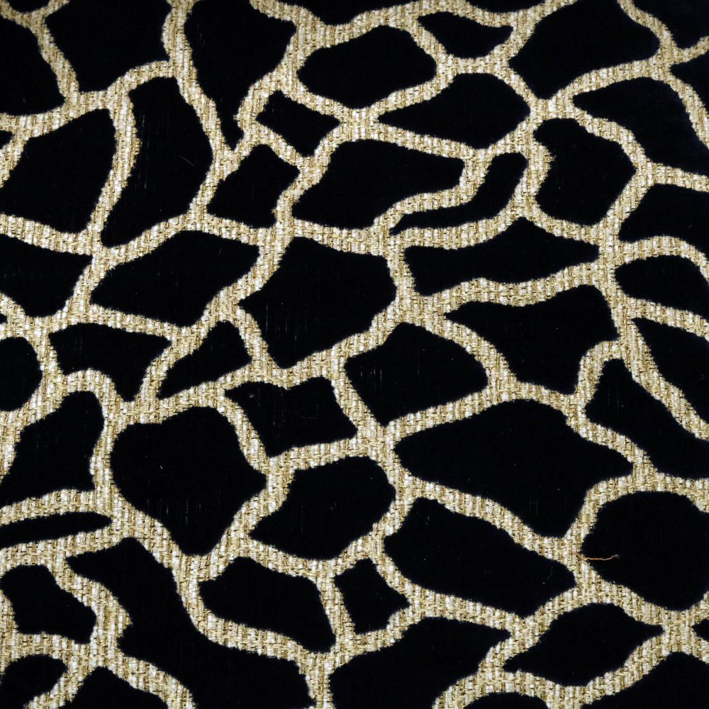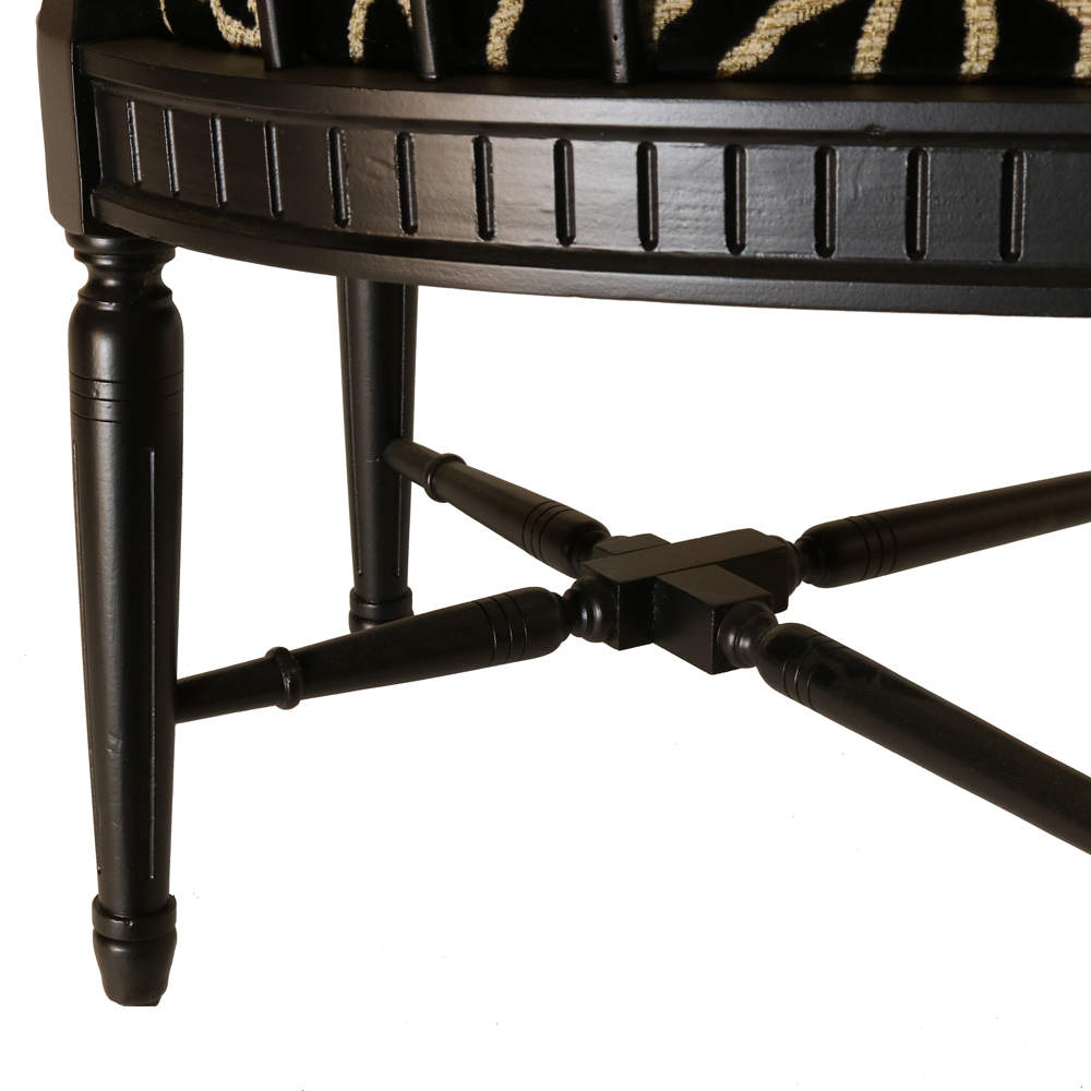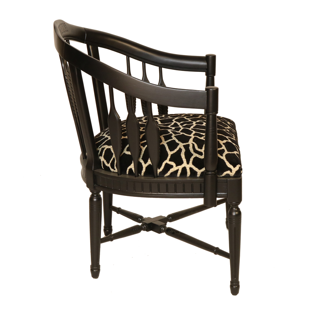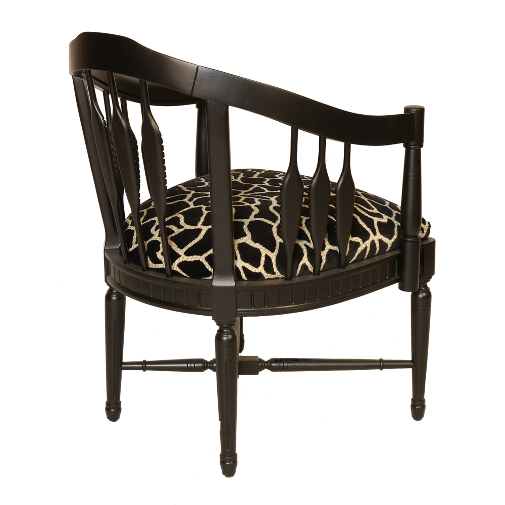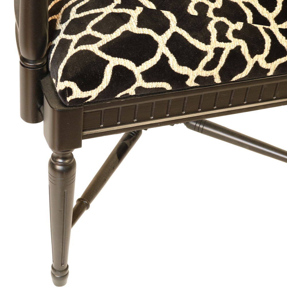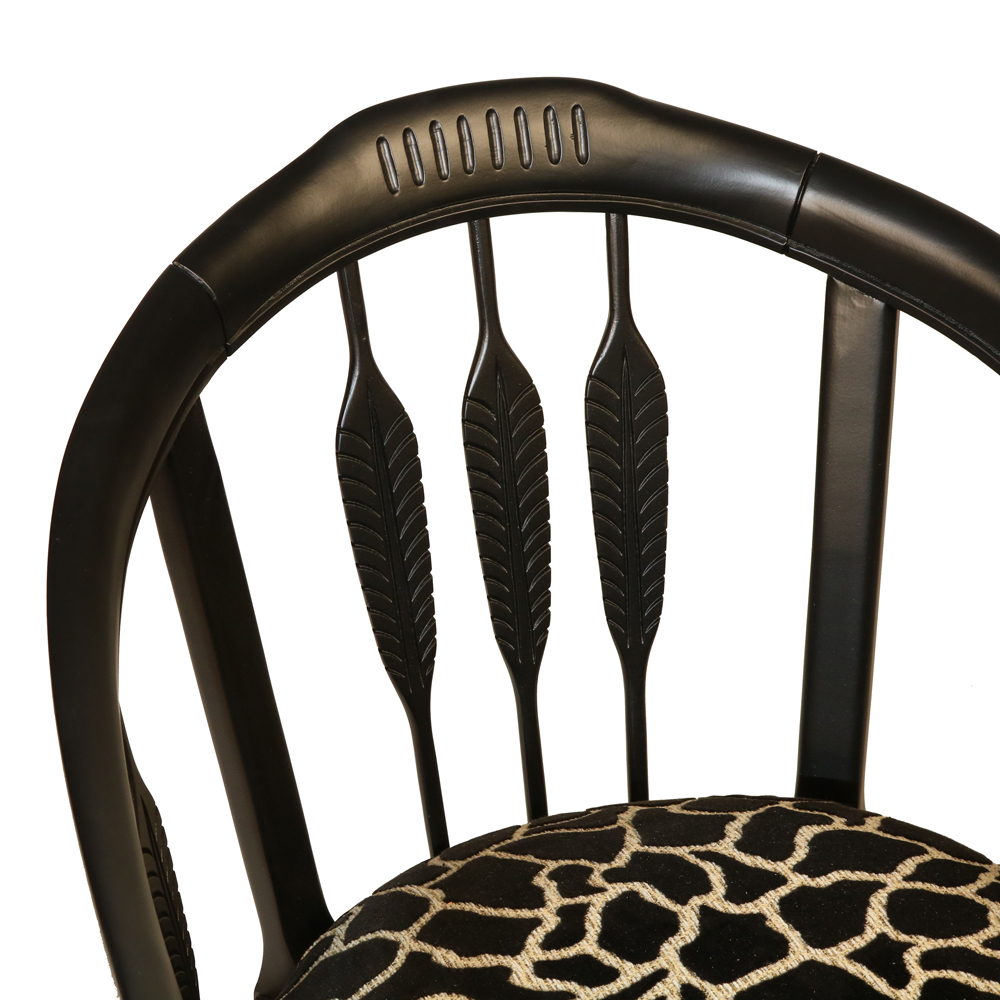The chair’s bold yet graceful frame is complemented by plush upholstery in a velvet brown animal print fabric, adding a layer of sophistication and texture. The animal print fabric offers a luxurious touch and contrasts beautifully with the deep walnut finish, creating a dynamic aesthetic.