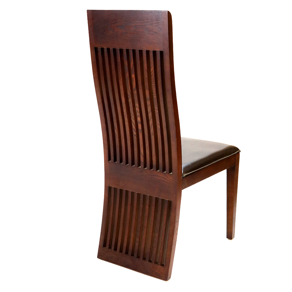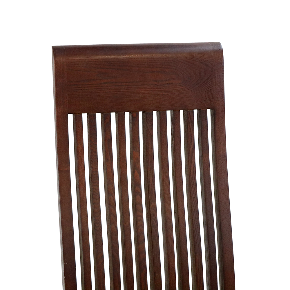 This chair is constructed from premium solid hardwood and boasts exceptional durability and timeless appeal. The tall, gently curved backrest features a series of vertical slats, providing a striking visual element and excellent support. The rich wood finish enhances the natural grain and texture of the hardwood, giving the chair a refined and polished appearance.